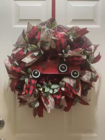 Beautiful buffalo red and black plaid fabric mesh , Christmas glitter ribbon and beige truck ribbon, with 13 inch metal red truck , greenery embellishments
