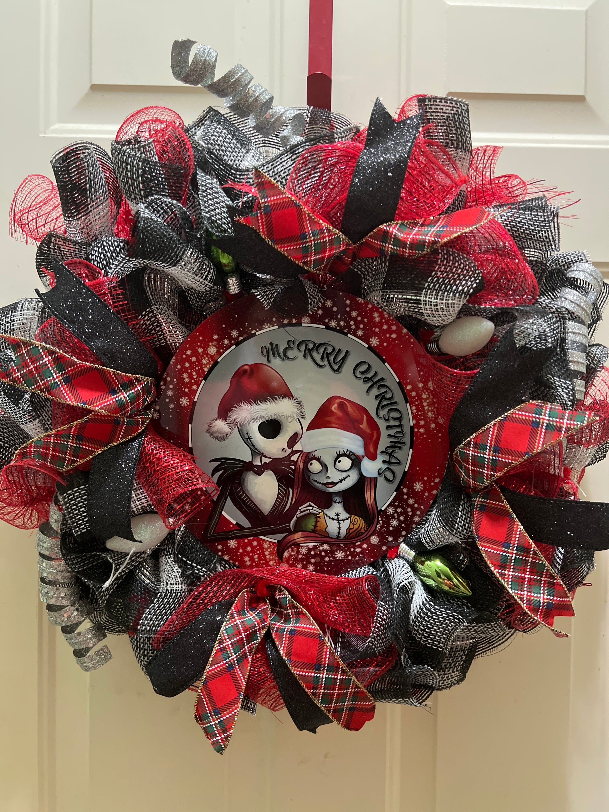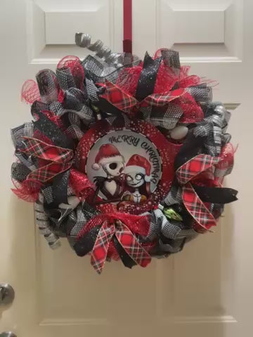Beautiful Christmas wreath made with Jack and Sally metal sign , Christmas plaid ribbon, black glitter ribbon, Christmas plastic bulbs and embellishments