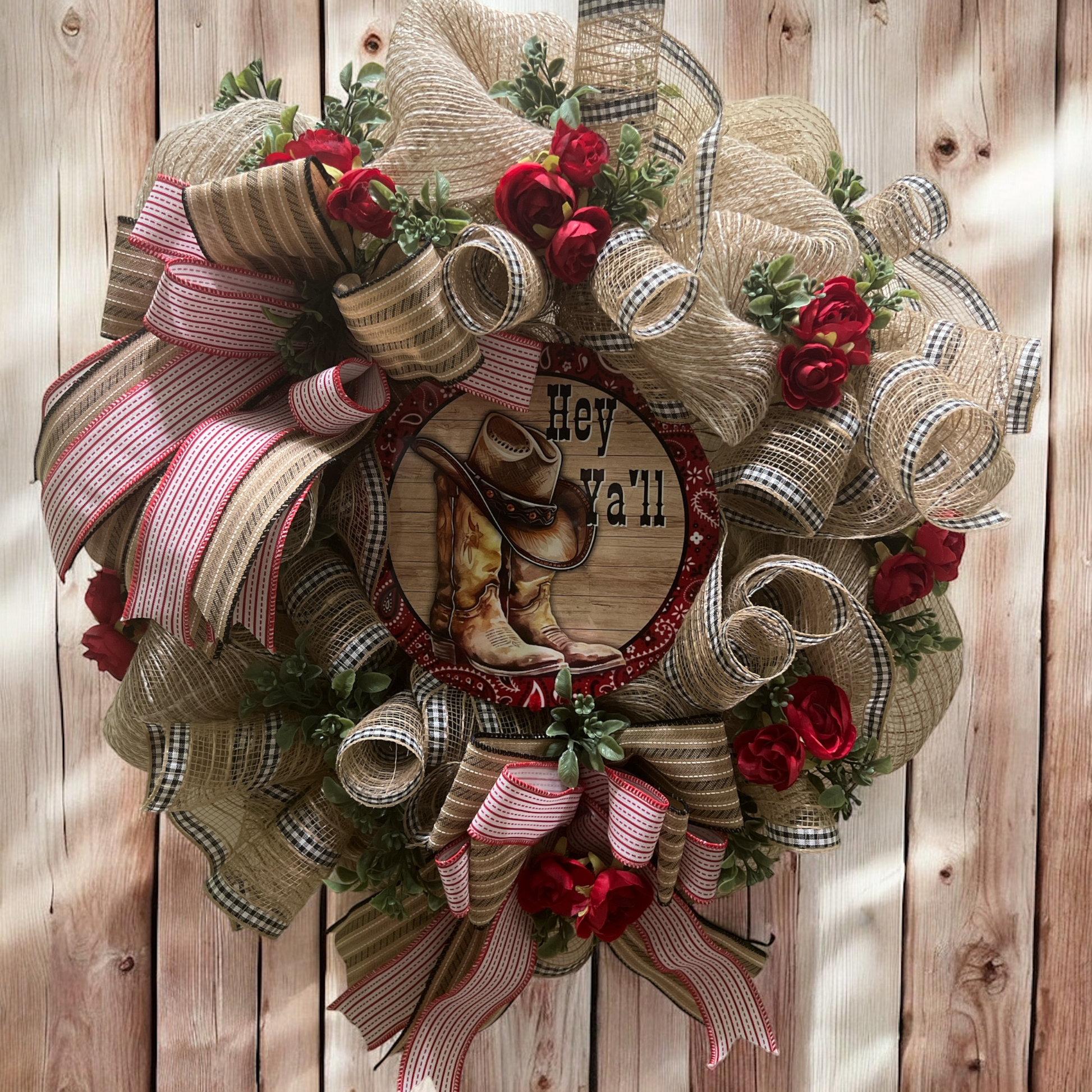 Large, fluffy western wreath made with burlap deco mesh , black/white deco mesh , striped ribbon in red and black , metal 8 inch sign , greenery and small floral roses