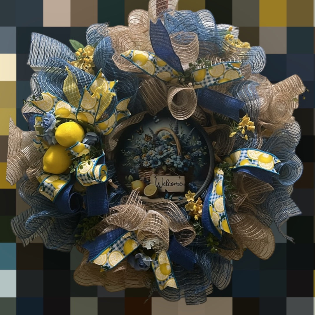 Beautiful and fluffy summer wreath made with denim color deco mesh , lemon plaid ribbon, metal welcome sign , measures 22x22x6