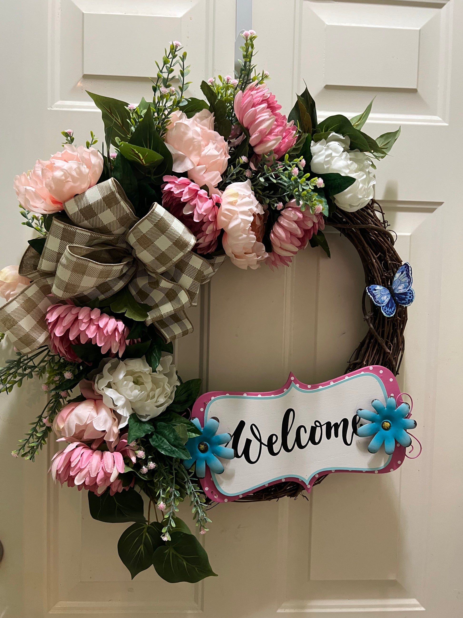 Grapevine base wreath made with pink and white floral , checkered beige/white ribbon , welcome wood sign
