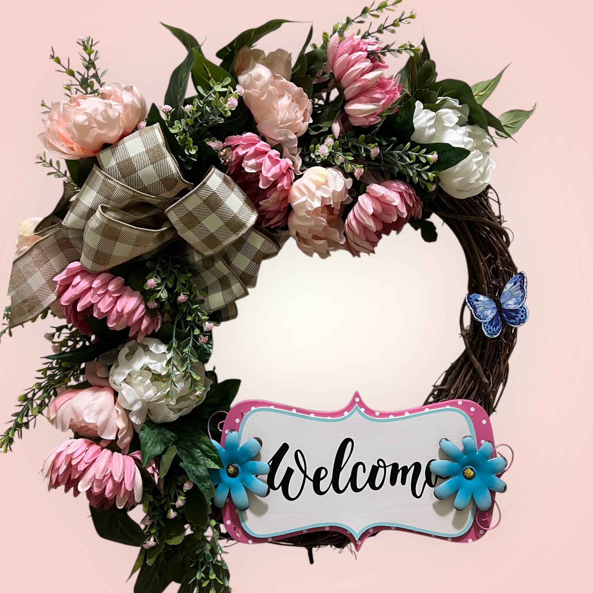 Grapevine wreath made with beige/white checkered ribbon , pink /white floral and greenery, wood welcome sign