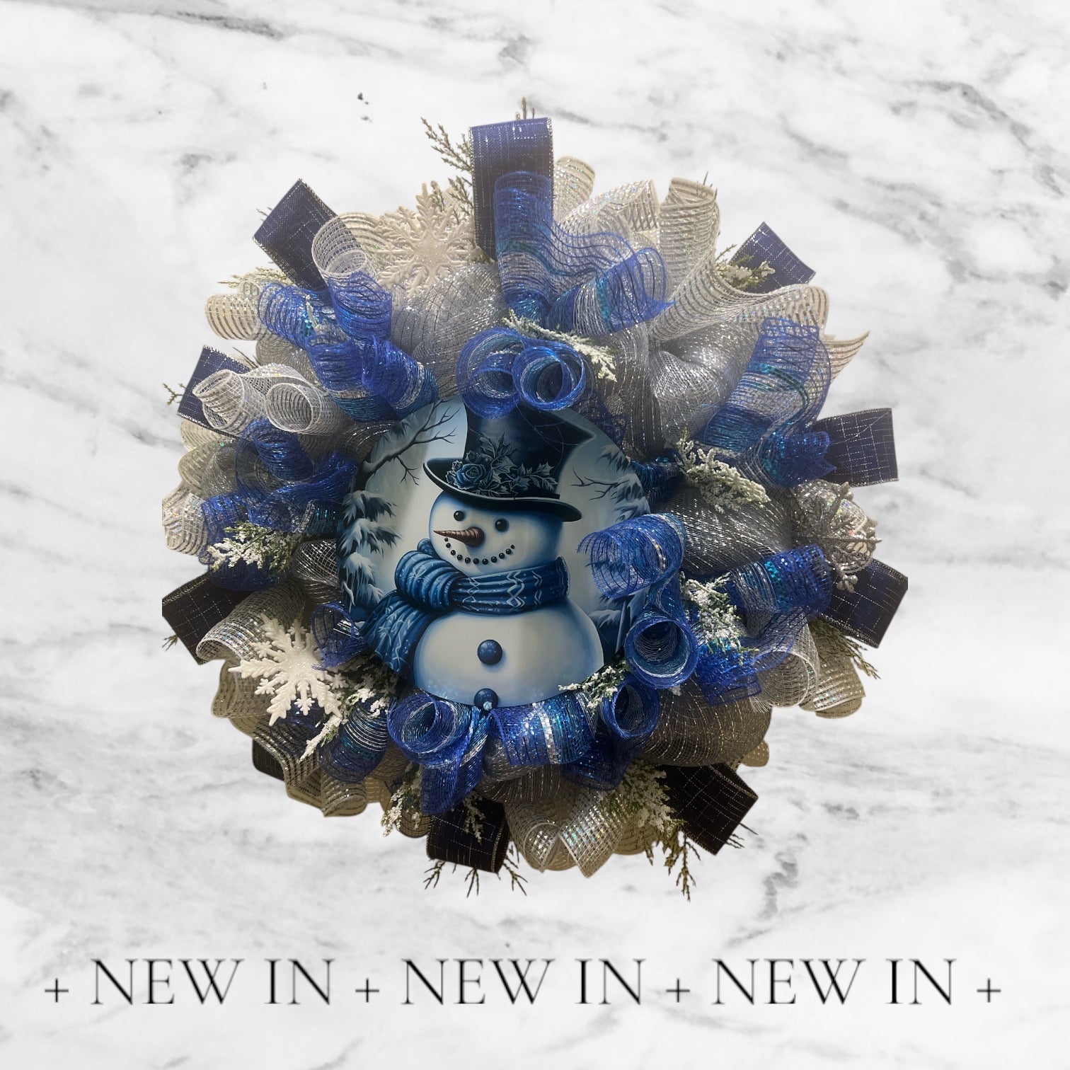 Royal blue and white deco mesh , Christmas ribbon and metal snowman sign