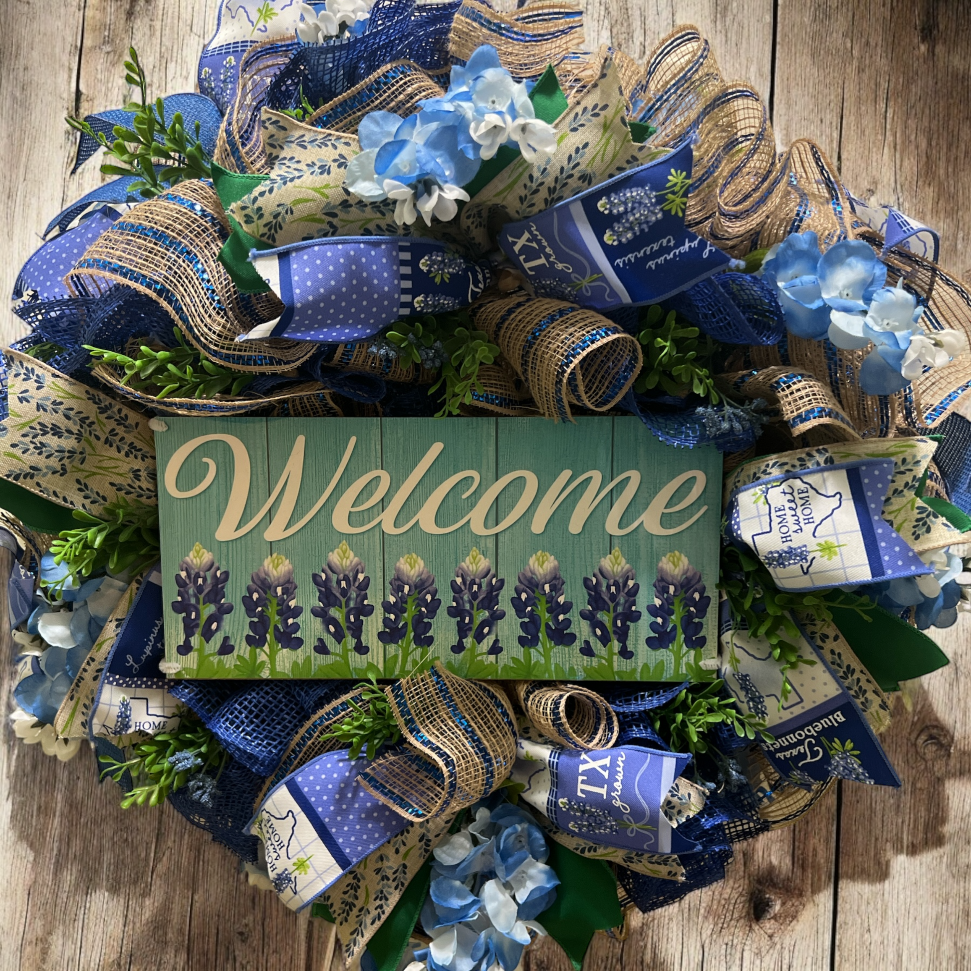 Beautiful fluffy wreath made with blue poky mesh, striped burlap/blue deco mesh, welcome wood bluebonnet sign , bluebonnet ribbon, green ribbon